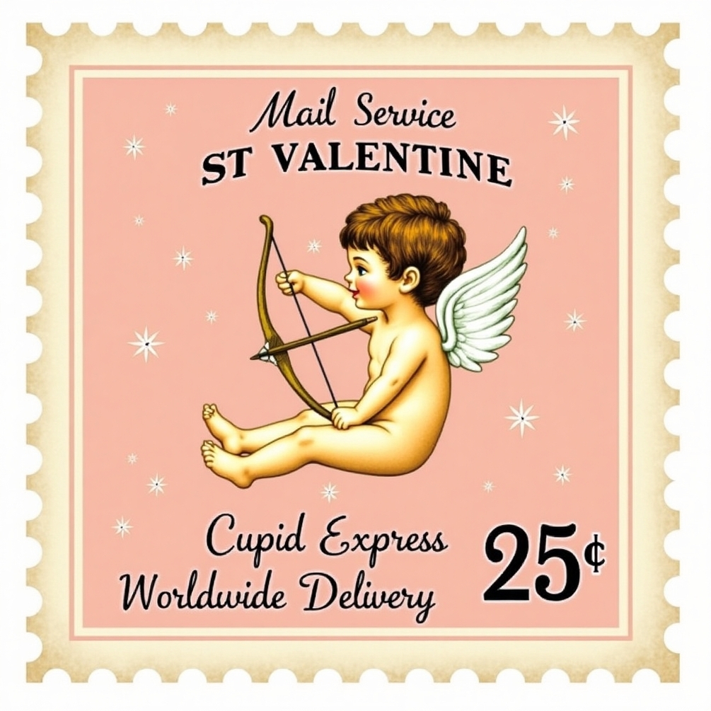Celebrate the spirit of romance with this enchanting vintage postage stamp design featuring Cupid, the playful symbol of love. Adorned with delicate wings and a bow, Cupid is poised to deliver heartfelt messages on a soft pastel pink background sprinkled with twinkling stars. The whimsical text 'Mail Service ST VALENTINE' and 'Cupid Express Worldwide Delivery' adds a charming touch, while the scalloped border and '25 cents' price evoke a sense of nostalgia. Perfect for Valentine's Day or to bring a touch of love to any occasion!